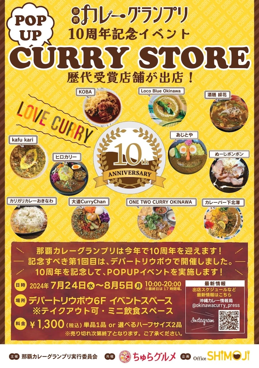 2024年7月24日(水)~8月5日(月)の期間、デパートリウボウ6Fイベントスペースにて、「POPUP CURRY STORE」が開催される。2014年にスタートした那覇カレーグランプリの10周年を記念したPOPUPイベント。