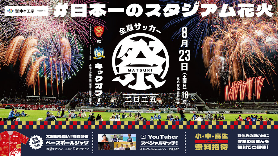 ◆当日18時まで!高校生以下は無料招待!FC琉球の試合&日本一のスタジアム花火やグルメも楽しもう