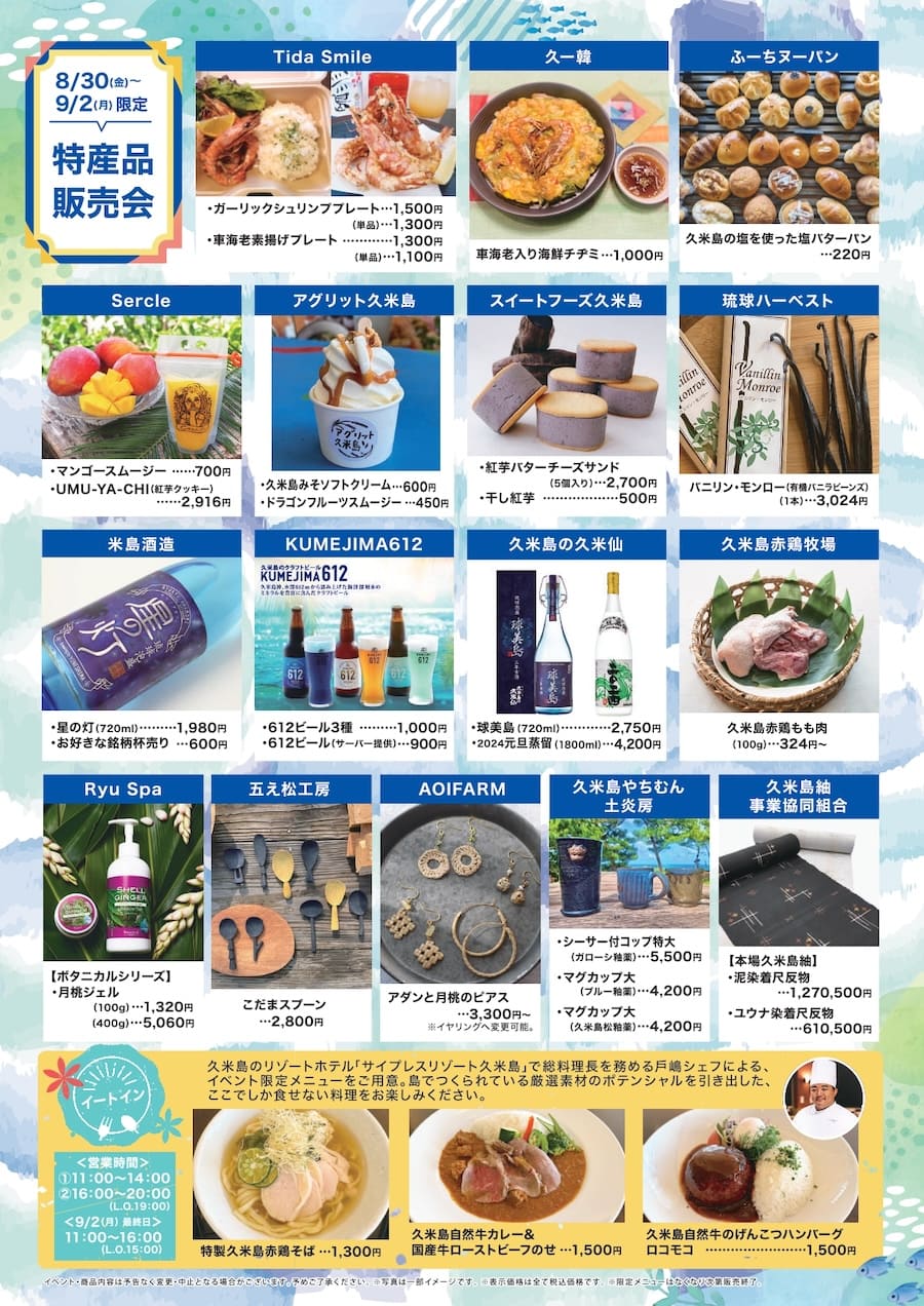 久米島グルメも見逃せない。イートインコーナーでは、久米島のリゾートホテル「サイプレスリゾート久米島」で総料理長を務めるシェフによるイベント限定メニューも。ここでしか味わえない料理を楽しもう。