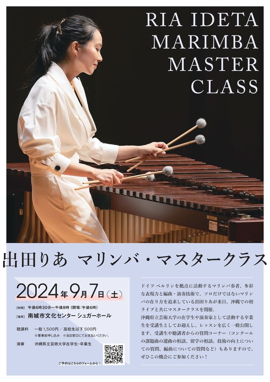 コンサート前日の9月7日(土)には、沖縄県立芸術大学の在学生や卒業生が演奏する「出田りあ マリンバ・マスタークラス」も沖縄初開催。聴講者からの質問コーナーもあるので、気軽に参加してみては。