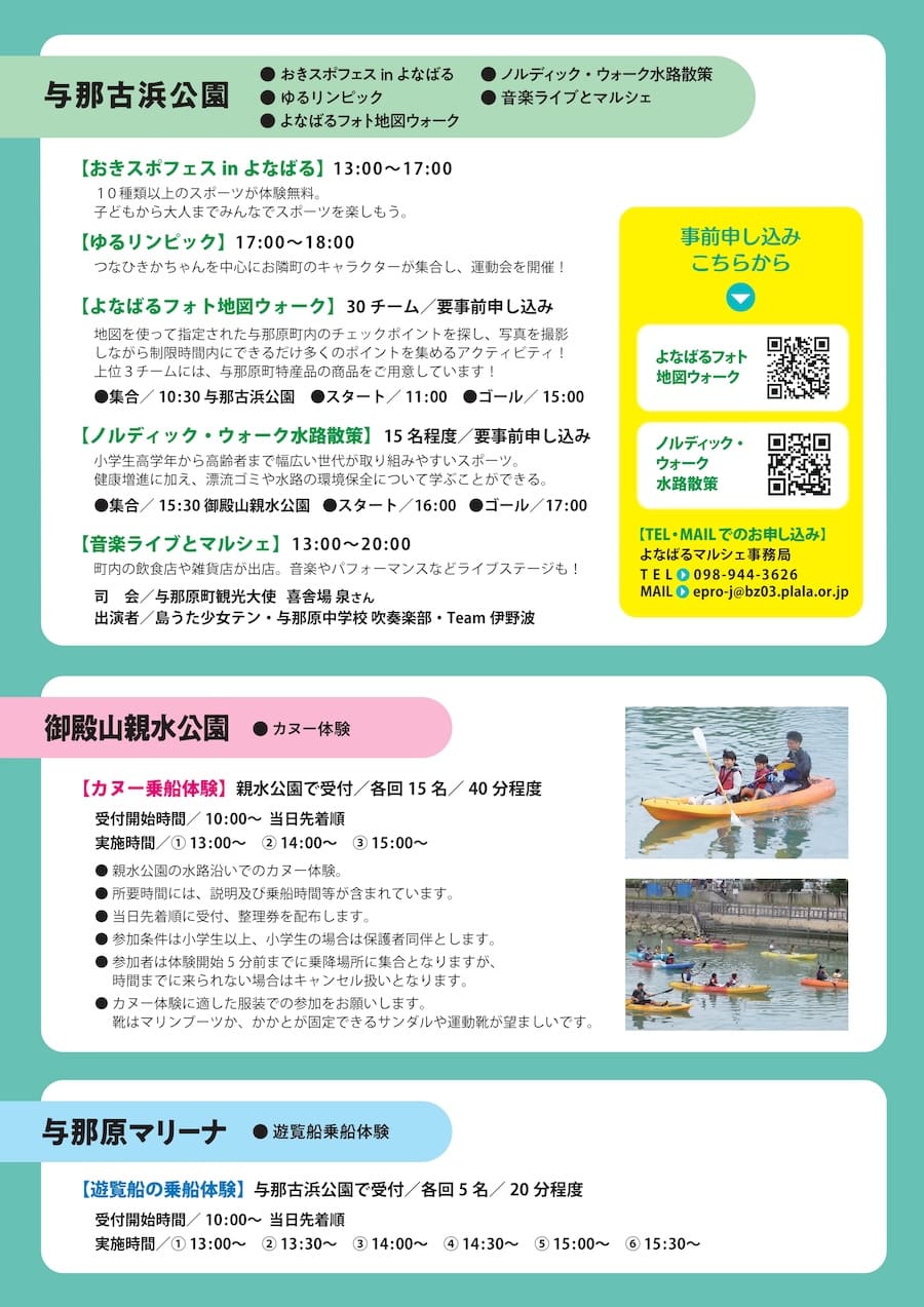 「ノルディック・ウォーク水路散策」や「よなばるフォト地図ウォーク」など、運動しながら学べる機会も。事前予約が必要なので、気になる方は早めにチェックしよう。