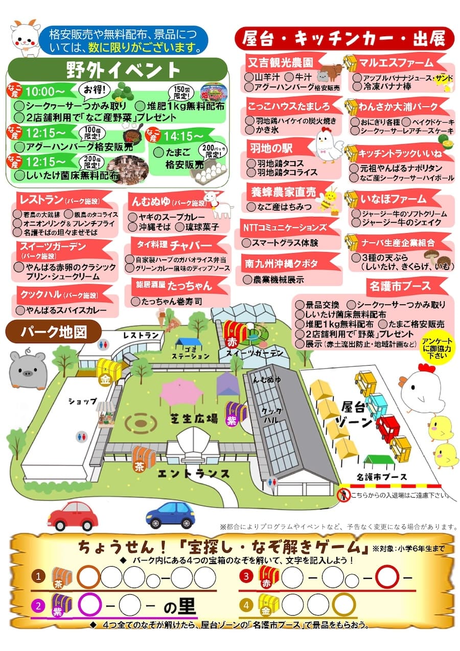 10時~ シークヮーサーつかみ取り、堆肥1kg無料配布(150袋限定)、2店舗以上で「なご産野菜」プレゼント