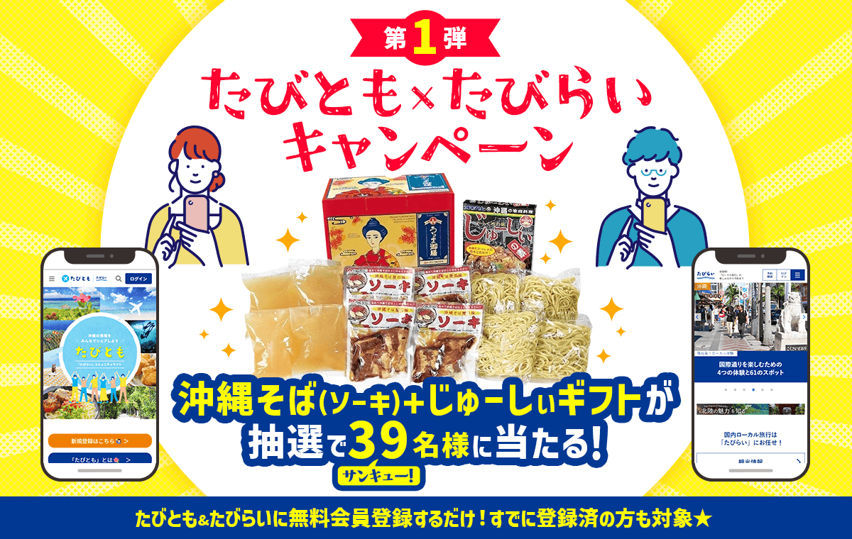 「たびとも×たびらいキャンペーン第1弾」は、期間中に”たびらい”と”たびとも”の2サイトに無料会員登録いただいた方の中から、抽選で39名様に「沖縄そば(ソーキ)+じゅーしぃギフト」をプレゼント。