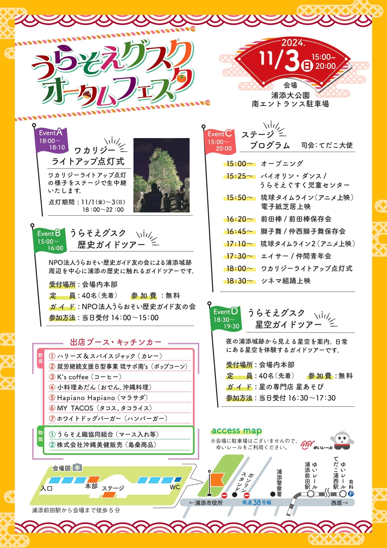 見て、食べて、体験して…浦添の文化を楽しむ「うらそえグスクオータムフェスタ」が11月3日(日)文化の日に、浦添大公園南エントランス駐車場にて初めて開催される。