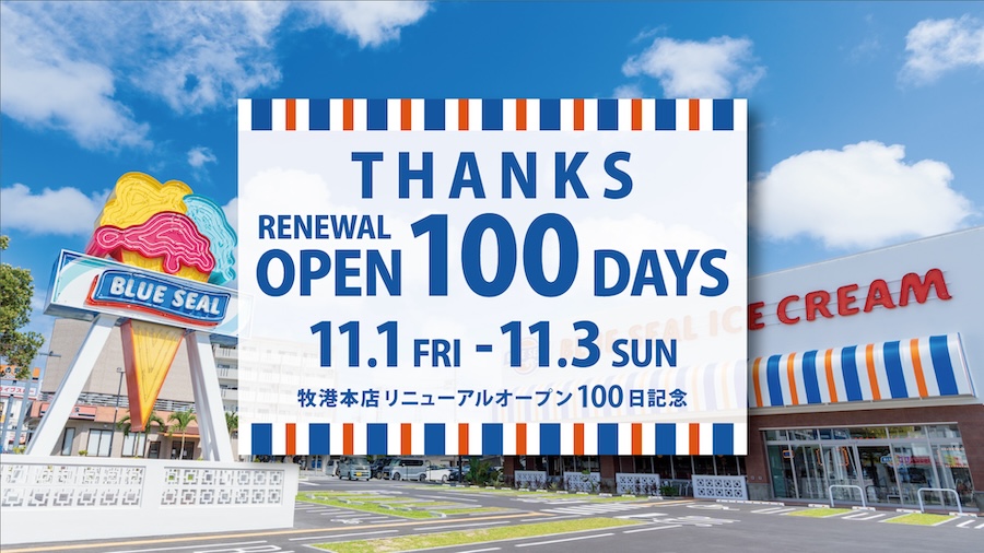 2024年11月1日(金)から11月3日(日)までの3日間、ブルーシール牧港本店リニューアルオープン100日記念キャンペーンが実施される。