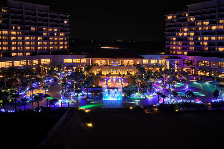 県内最大級の規模を誇る約10,000平米のプールエリアと、広大な約4,000平米の芝生エリアを彩るのは、約30万球にもおよぶ優美な光。壮大なスケールで展開される光の幻想世界が琉球ホテル&リゾート 名城ビーチの夜を彩る。