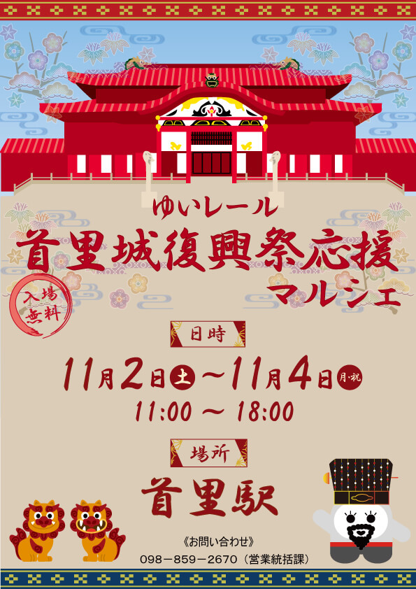 2024年11月2日(土)~11月4日(月・振休)の3日間、モノレール首里駅構内にて「ゆいレール首里城復興祭応援マルシェ」が開催される。