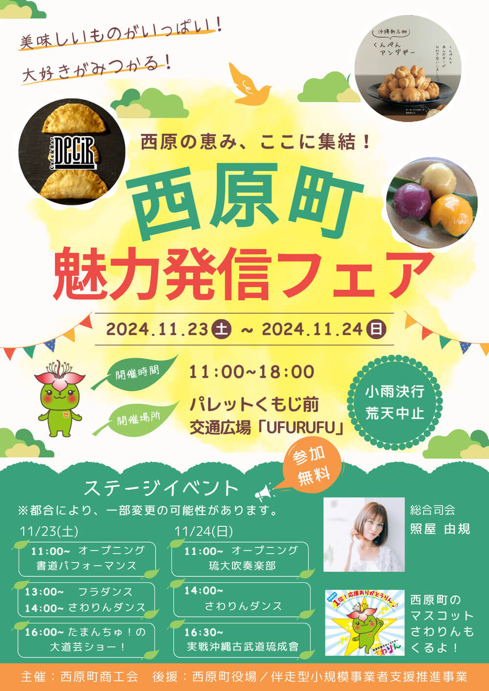 2024年11月23日(土)・24日(日)の2日間、那覇市パレットくもじ前交通広場UFURUFUにて「西原町魅力発信フェア」が開催される。