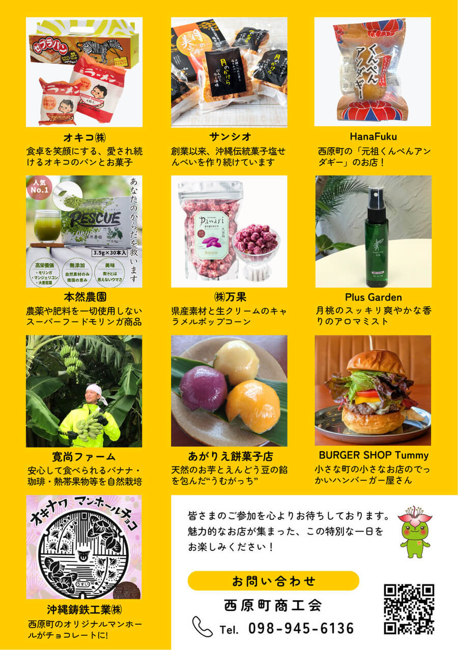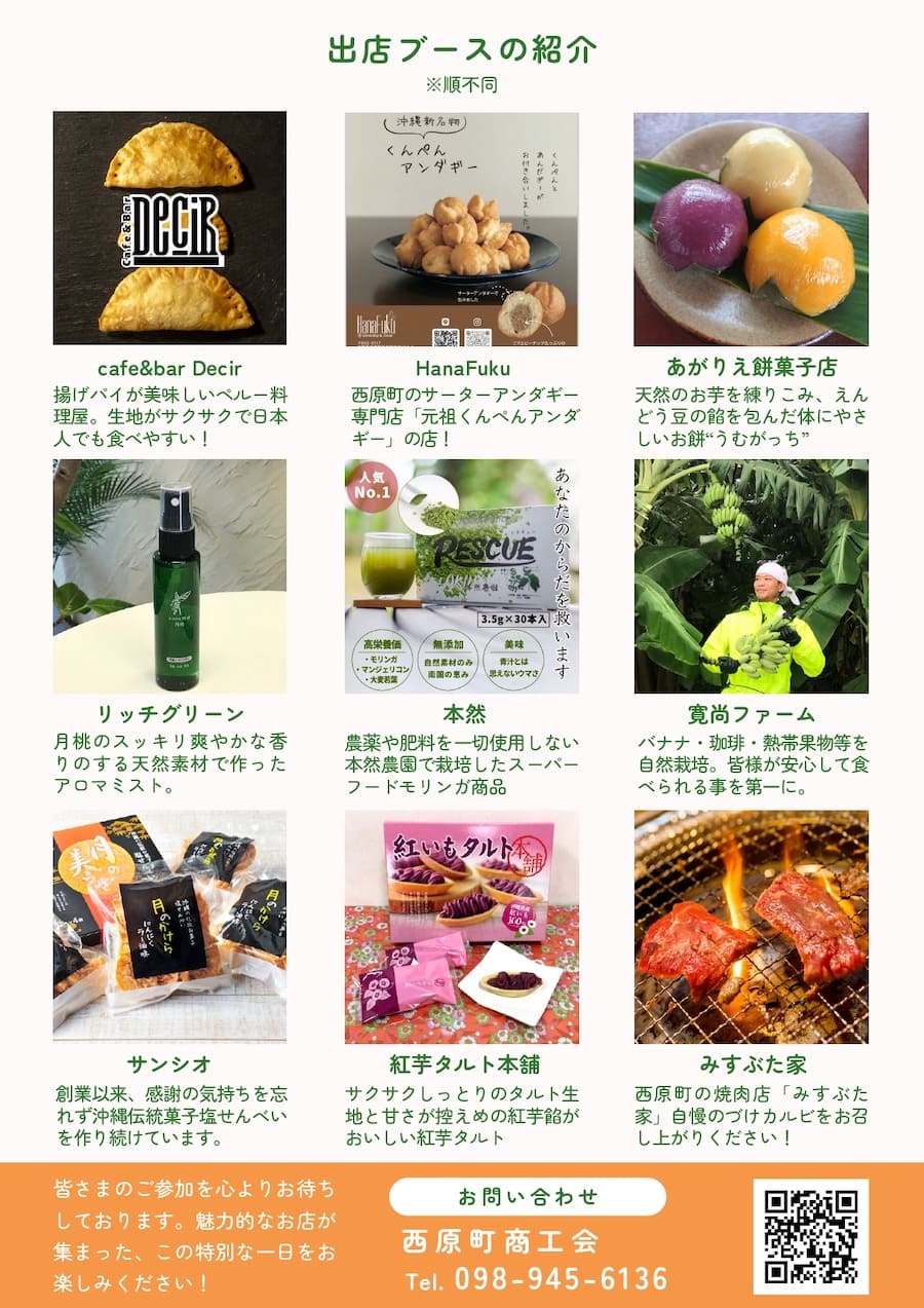 西原町自慢の特産品が集まるイベント。お土産にも喜ばれそうなお菓子やスイーツ、月桃を使ったアロマミストやスーパーフードのモリンガ商品など、個性豊かな品が並ぶ。