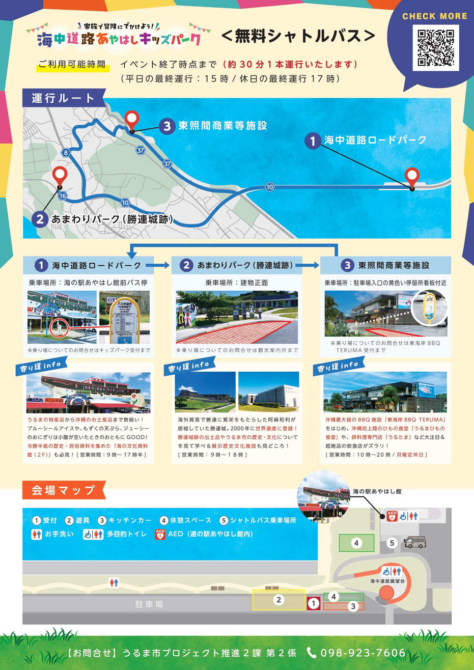 イベント会場の海中道路ロードパークへは、うるま市内にある「あまわりパーク(勝連城跡)」と「東照間商業等施設」から無料シャトルバスが運行しているので、会場へのアクセスも安心だ。