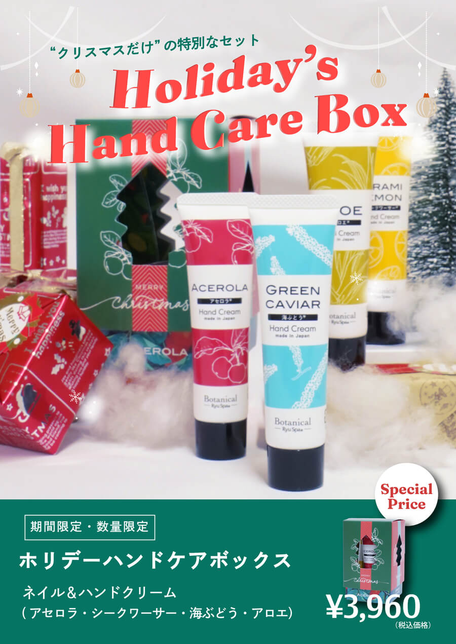 沖縄のホリデーシーズンにぴったりの、アセロラ、シークワーサー、海ぶどう、アロエの香りが入った4本セット。通常はハンドクリーム4本で5,720円(税込)のところ、ハンドケアBOXは3,960円(税込)と、お財布にも優しい。