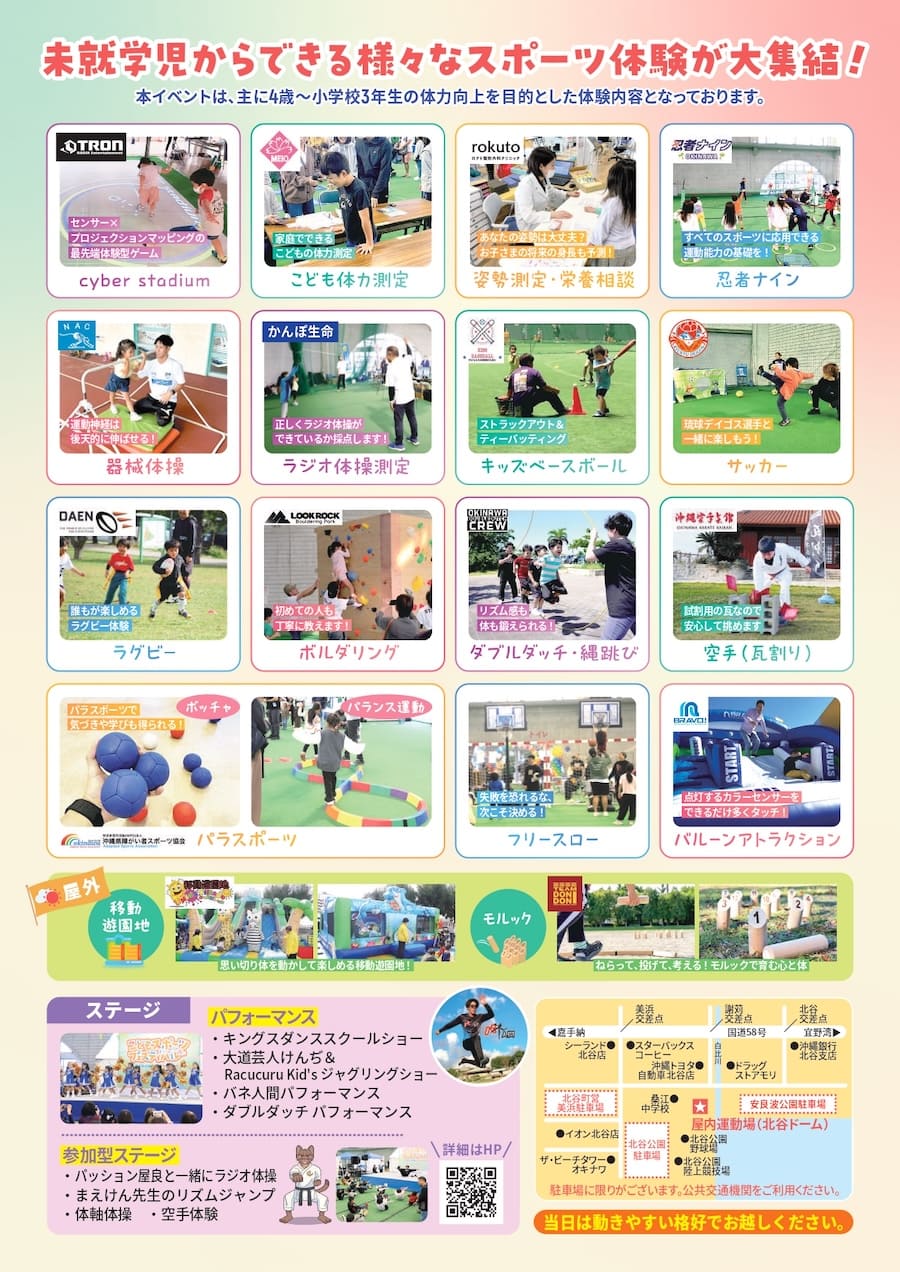 おきなわ応援ポケモンのガーディもやってきて、イベントを盛り上げる。“子ども体力測定”で子どもの体力や運動する力を測ったり、ステージで行われる”スポーツ教室体験”や”大道芸人けんぢ”、”バネ人間”のパフォーマンスを観ることで、動くことの楽しさを感じる機会になるはず。