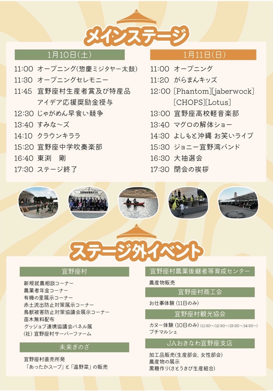 メインステージでは、宜野座村の特産品のじゃがめんを使った沖縄そばの早食い大会や、沖縄よしもとのショー、ジョニー宜野湾バンドショーなど、盛り上がるプログラムが多数。
