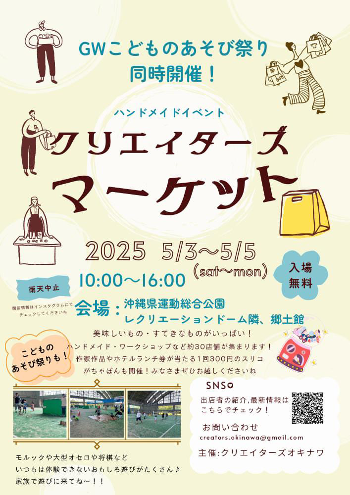 2025年5月3日(土・祝)~5月5日(月・祝)の3日間、沖縄市にある県総合運動公園にてハンドメイドイベント「クリエイターズマーケット」が開催される。