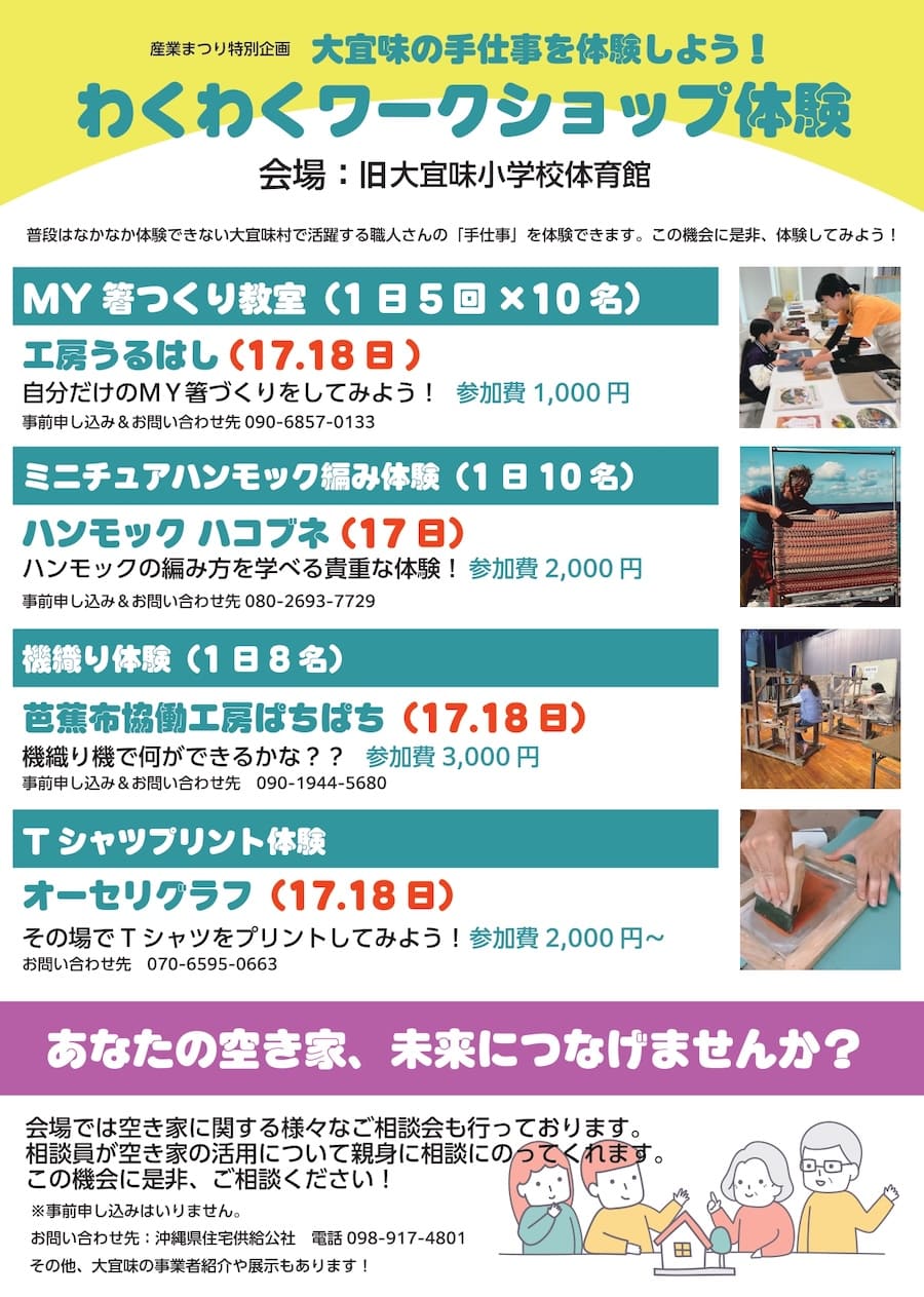 大宜味村の手仕事を体験できるワークショップも充実。MY箸つくり教室やミニチュアハンモック編み体験、機織り体験やTシャツプリント体験など、普段はなかなか体験できない職人の技に触れることができる。申し込みや詳細は公式HPで確認を。