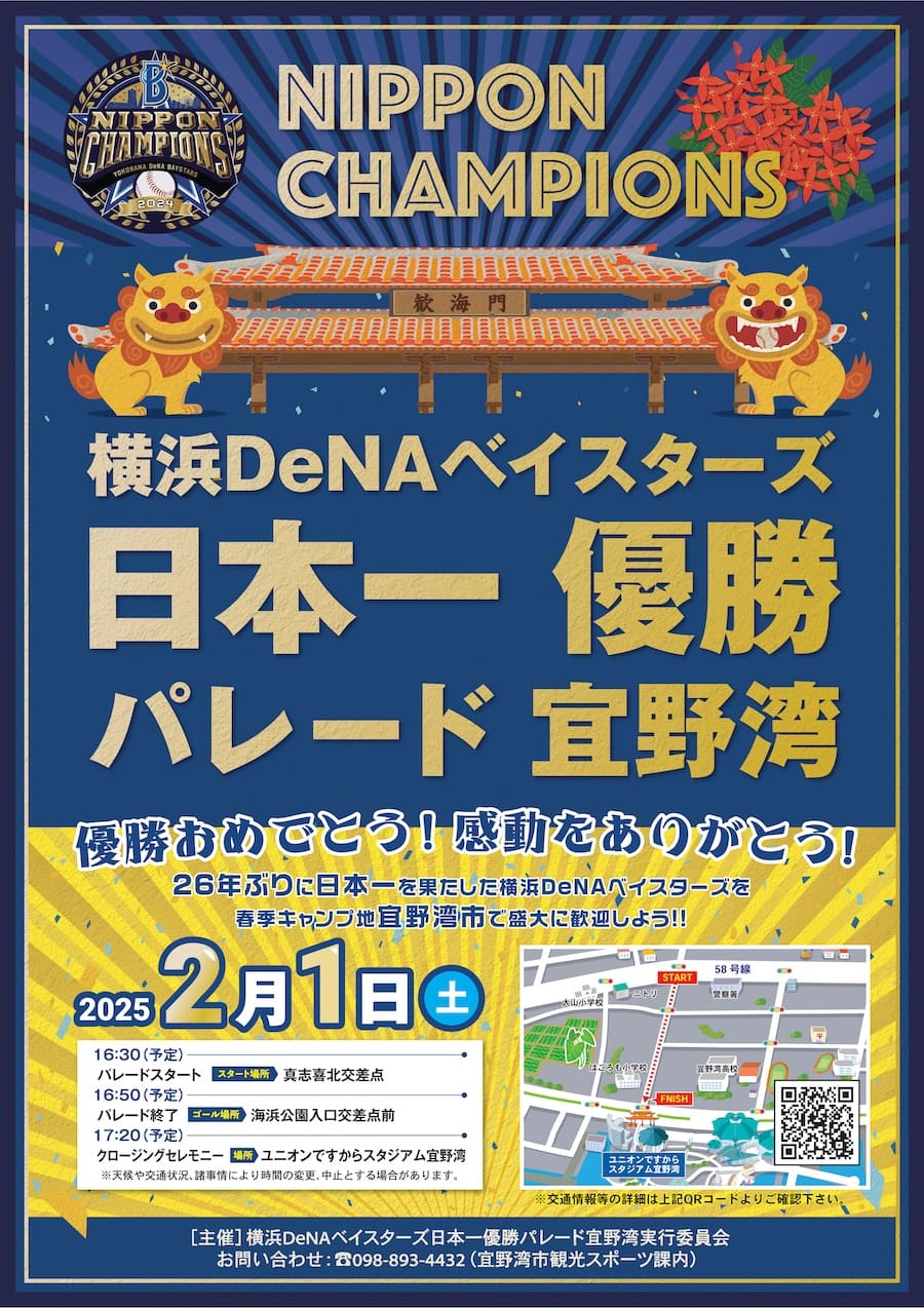 2025年2月1日(土)、「横浜DeNAベイスターズ日本一優勝パレード宜野湾」が宜野湾市の歓海門通りで開催される。