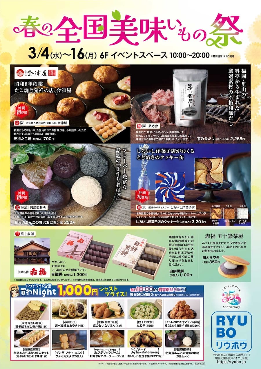 2026年3月4日(水)~3月16日(月)の期間、デパートリウボウにて「春の全国美味いもの祭」が開催される。