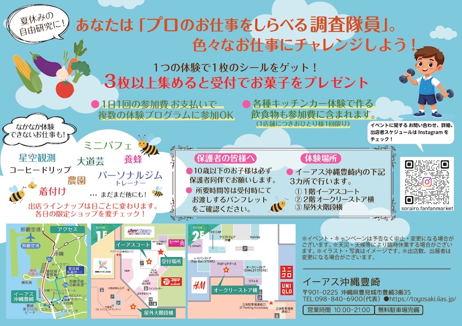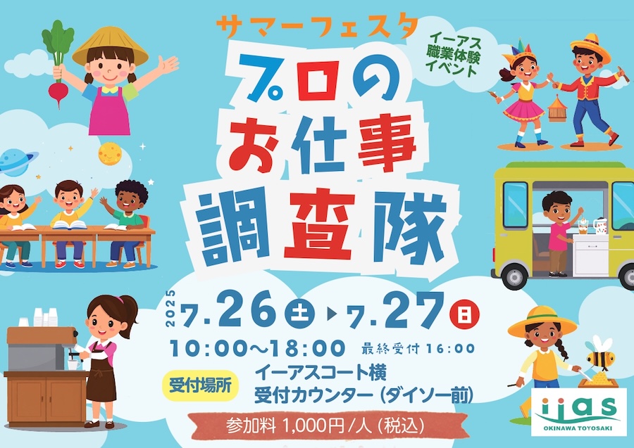 2025年7月26日(土)と7月27日(日)の2日間、イーアス沖縄豊崎にて「サマーフェスタ~プロのお仕事調査隊~ in イーアス」が開催される。