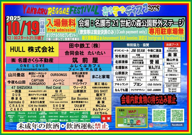 2025年10月19日(日)、名護市にある21世紀の森公園野外ステージで「第21回 山原レゲエ祭 青空ディスコ2025」が開催される。入場は無料。