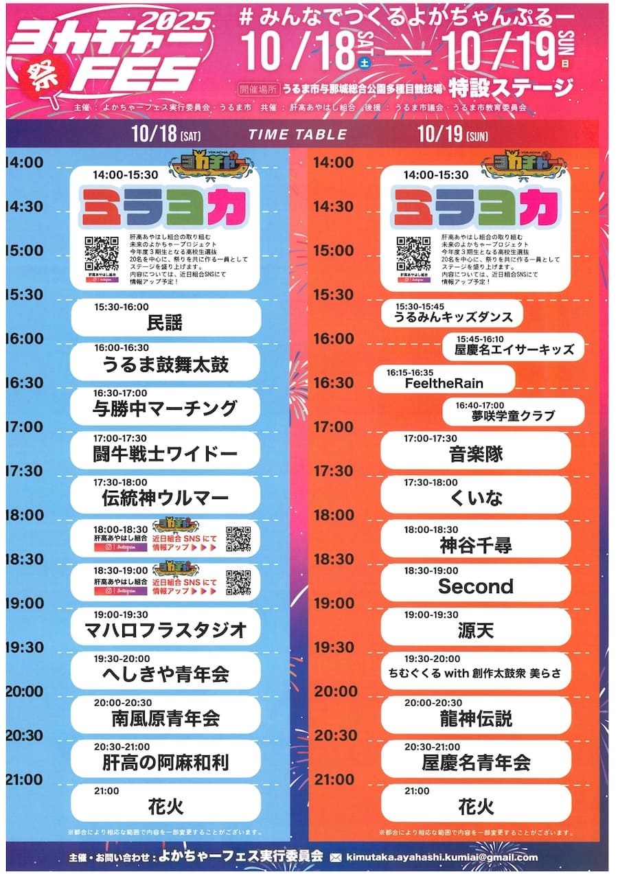 両日14時からは、肝高あやはし組合の取り組む未来のよかちゃープロジェクト「ミラヨカ」の舞台発表。20名の高校生が、祭りを盛り上げる。どんな内容かはインスタグラムで確認を。