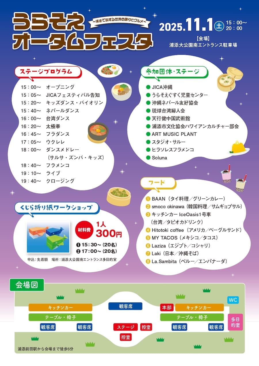 2025年11月1日(土)、浦添大公園南エントランス駐車場にて「うらそえオータムフェスタ~浦添で旅する世界の踊りとグルメ~」が開催される。浦添市市制施行55周年を記念した特別企画。