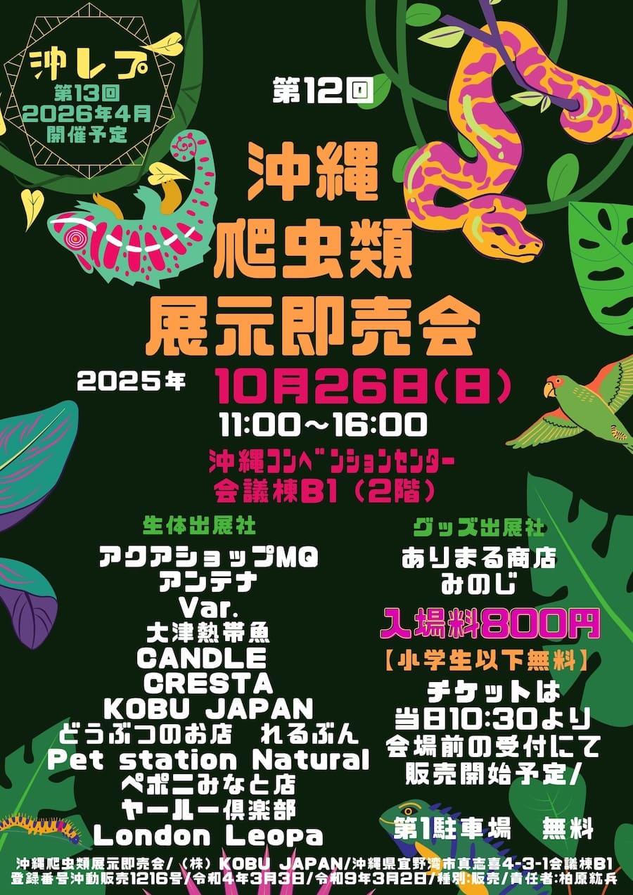 2025年10月26日(日)、沖縄コンベンションセンターにて「第12回 沖縄爬虫類展示即売会」が開催される。小学生以下は入場無料。