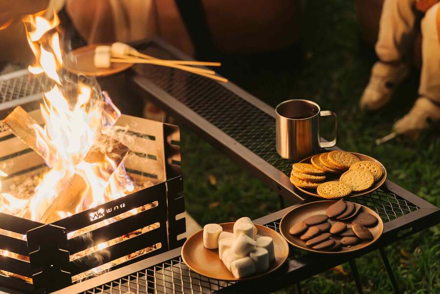 期間中にはファイヤーピットによる焚火を楽しめる日も用意。焚火を使って自分自身でマシュマロを焼いて「スモア」を作る体験もできる。