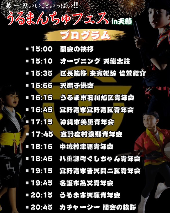 子育てや仕事、学校など日々頑張っている地域の皆様の息抜きになれたらという想いで天願青年会が企画。県内各地から青年会が集い、迫力あるエイサー演舞を披露する。