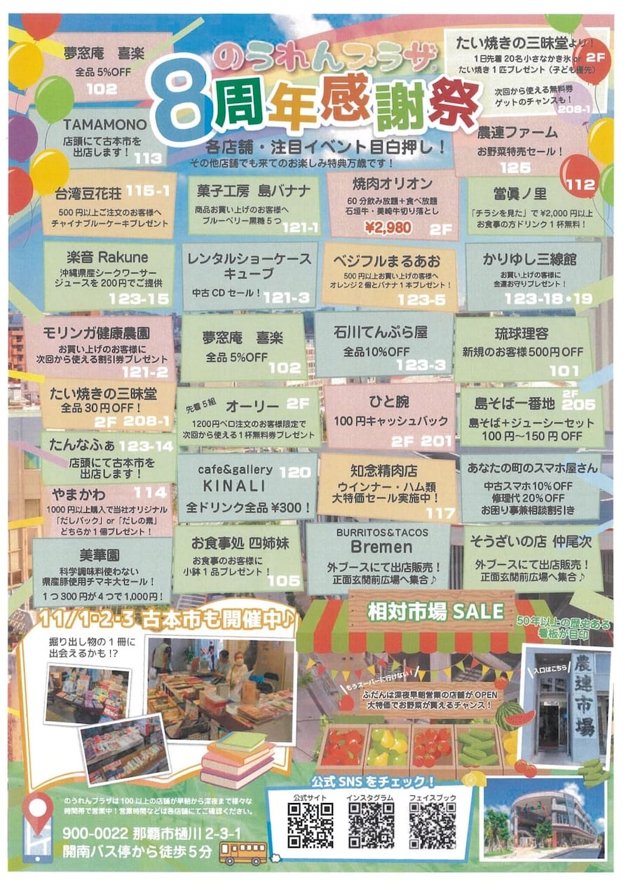 2025年11月1日(土)、2日(日)、3日(月・祝)の3日間、那覇市ののうれんプラザで「のうれんプラザ感謝祭~8周年だヨ!全員集合!~」が開催される。