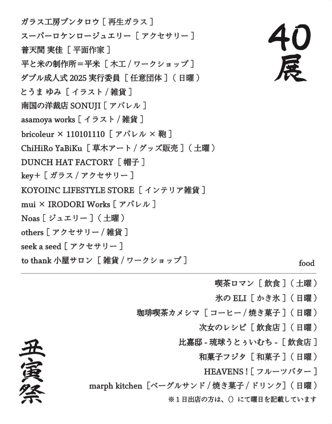今年度40歳を迎える、丑年・寅年のメンバーが開催するイベント。ものづくり、飲食、アートなど多種多様な分野で活躍する40歳たちが、それぞれの作品やフードの販売、ワークショップなどを実施。