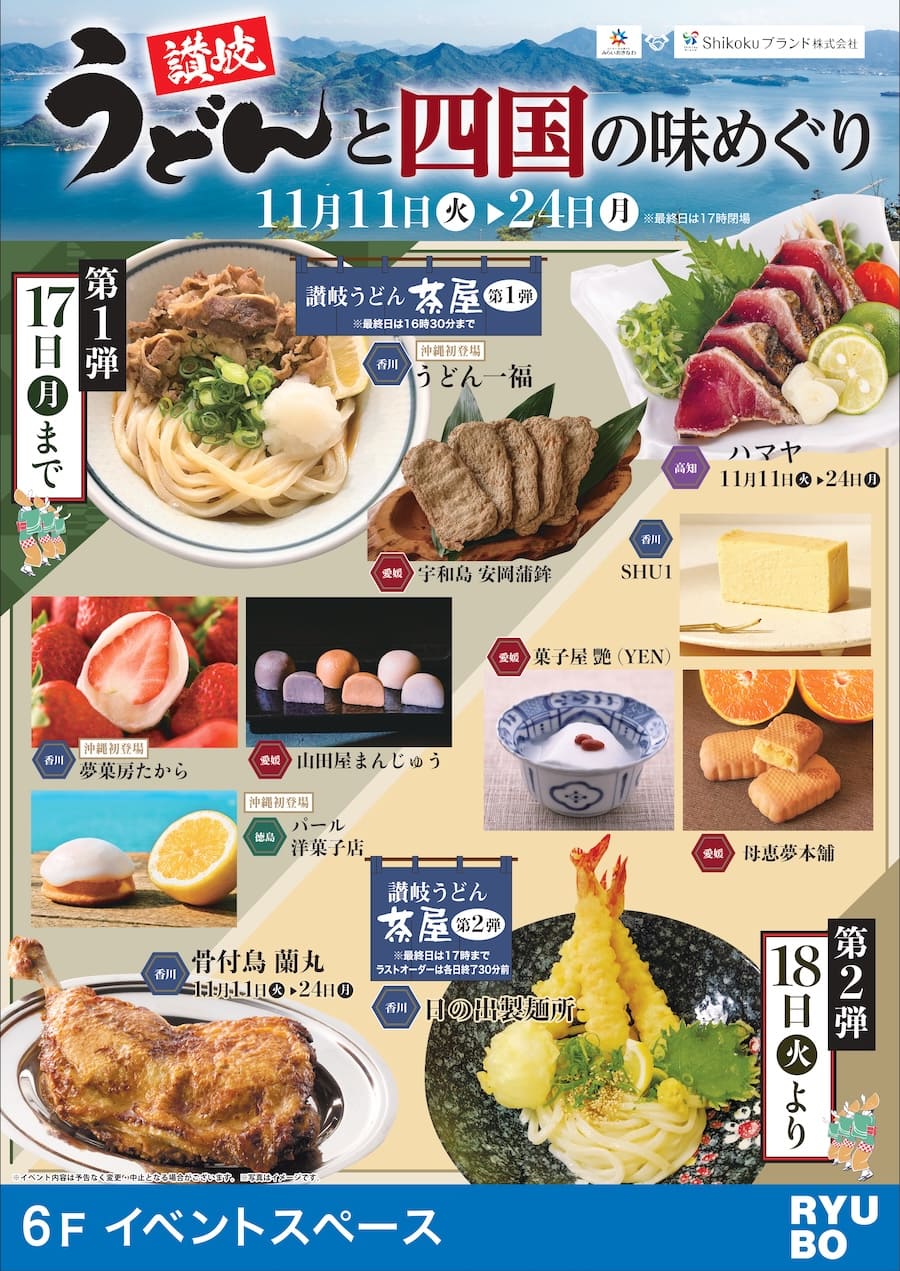 香川の「夢工房たから」、徳島の「パール洋菓子店」も沖縄初登場。四国の魅力がギュッと詰まった「讃岐うどんと四国の味めぐり」で、食欲の秋を満喫しよう。