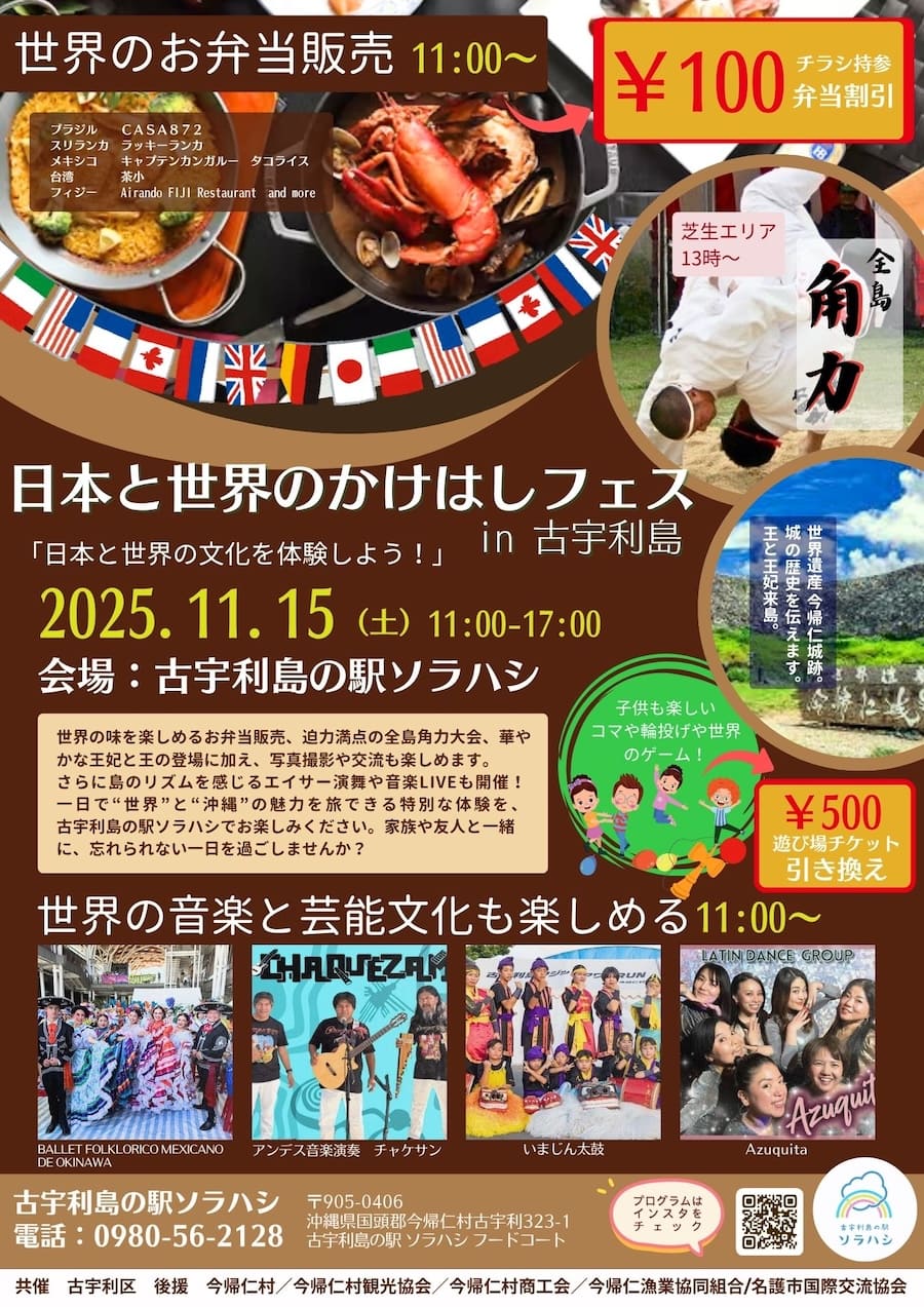 2025年11月15日(土)、今帰仁村の古宇利島の駅ソラハシにて「日本と世界のかけはしフェス」が開催される。