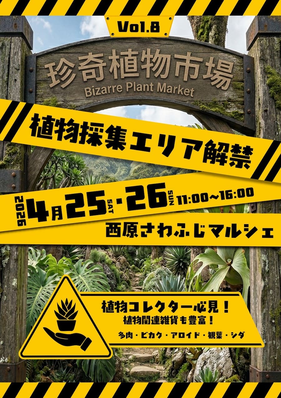 2026年4月25日(土)と26日(日)の2日間、西原さわふじマルシェにて「珍奇植物市場Vol.8」が開催される。入場無料。