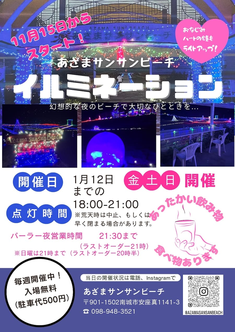 2025年11月15日(土)~2026年1月12日(月・祝)期間中の、金・土・日曜日、南城市のあざまサンサンビーチにてイルミネーションが点灯。幻想的な夜のビーチを楽しめる。