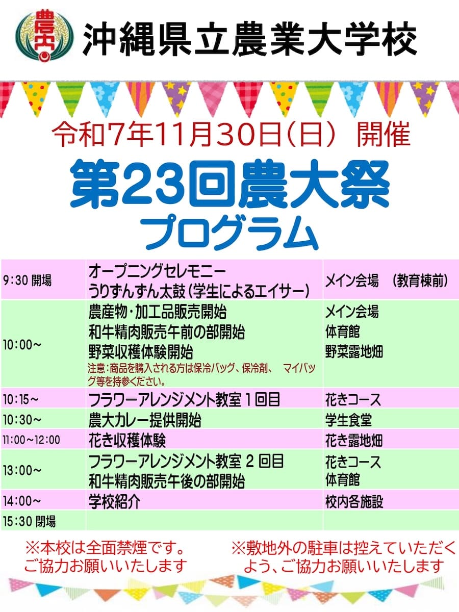2025年11月30日(日)、宜野座村にある沖縄県立農業大学校にて「令和7年度 第23回農大祭」が開催される。