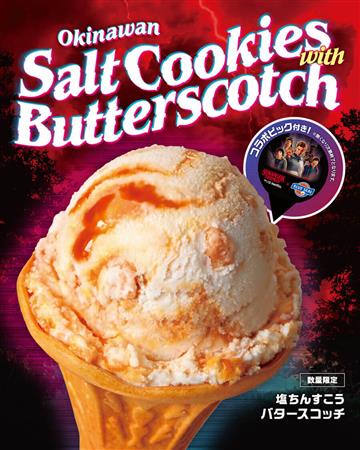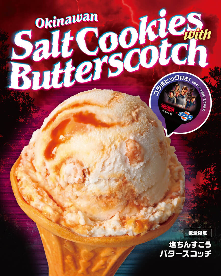 「ストレンジャー・シングス」に登場するアイスクリームショップ「Scoops Ahoy」でも人気な「バタースコッチ」を、ブルーシールの人気NO.1フレーバー「塩ちんすこう」と組み合わせた限定フレーバー。 「ストレンジャー・シングス」の世界観とブルーシールらしさ、どちらも楽しめる。