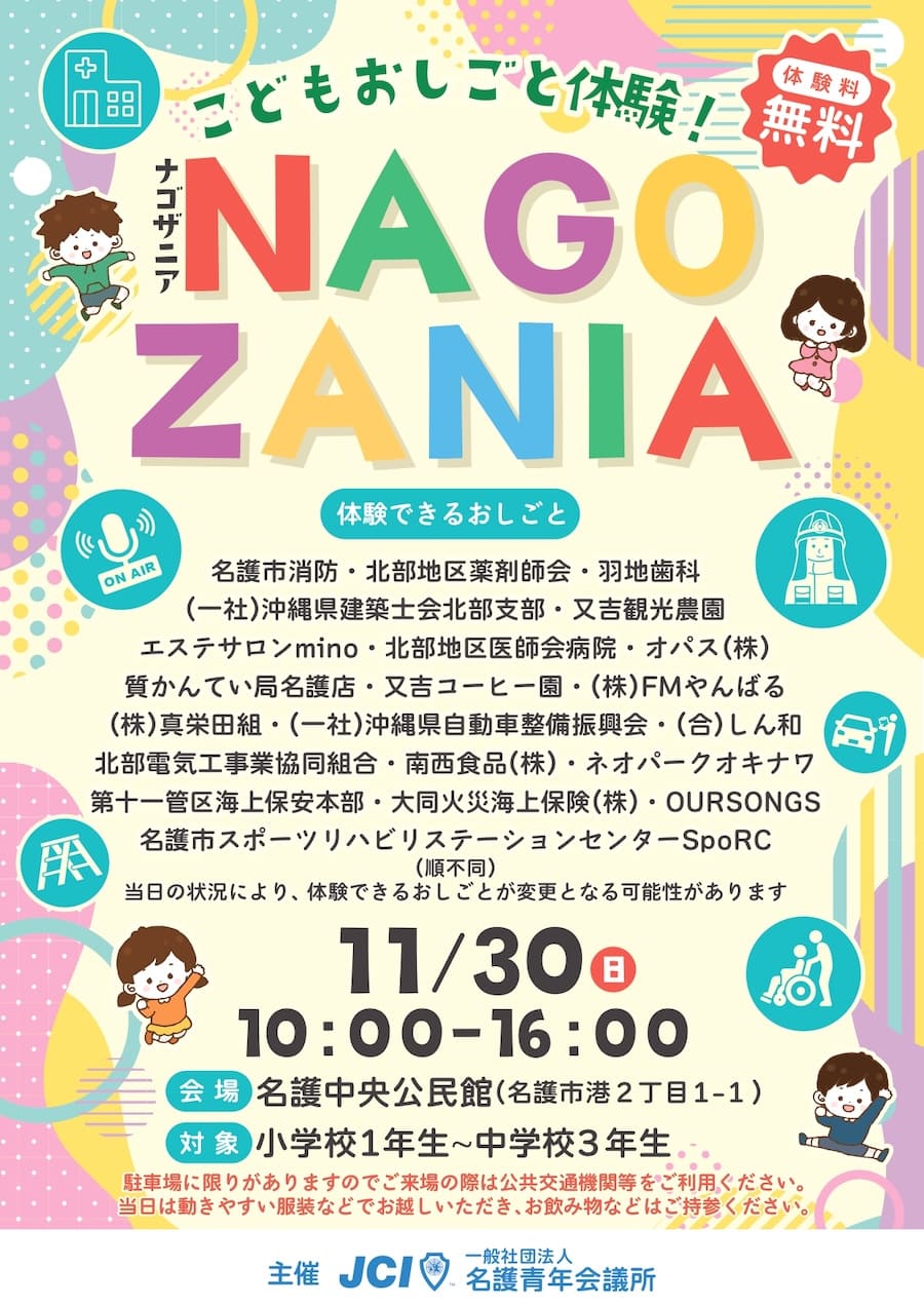 2025年11月30日(日)、名護中央公民館にて「NAGOZANIA」が開催される。名護市の小学生・中学生を対象にしたイベントで、体験無料。