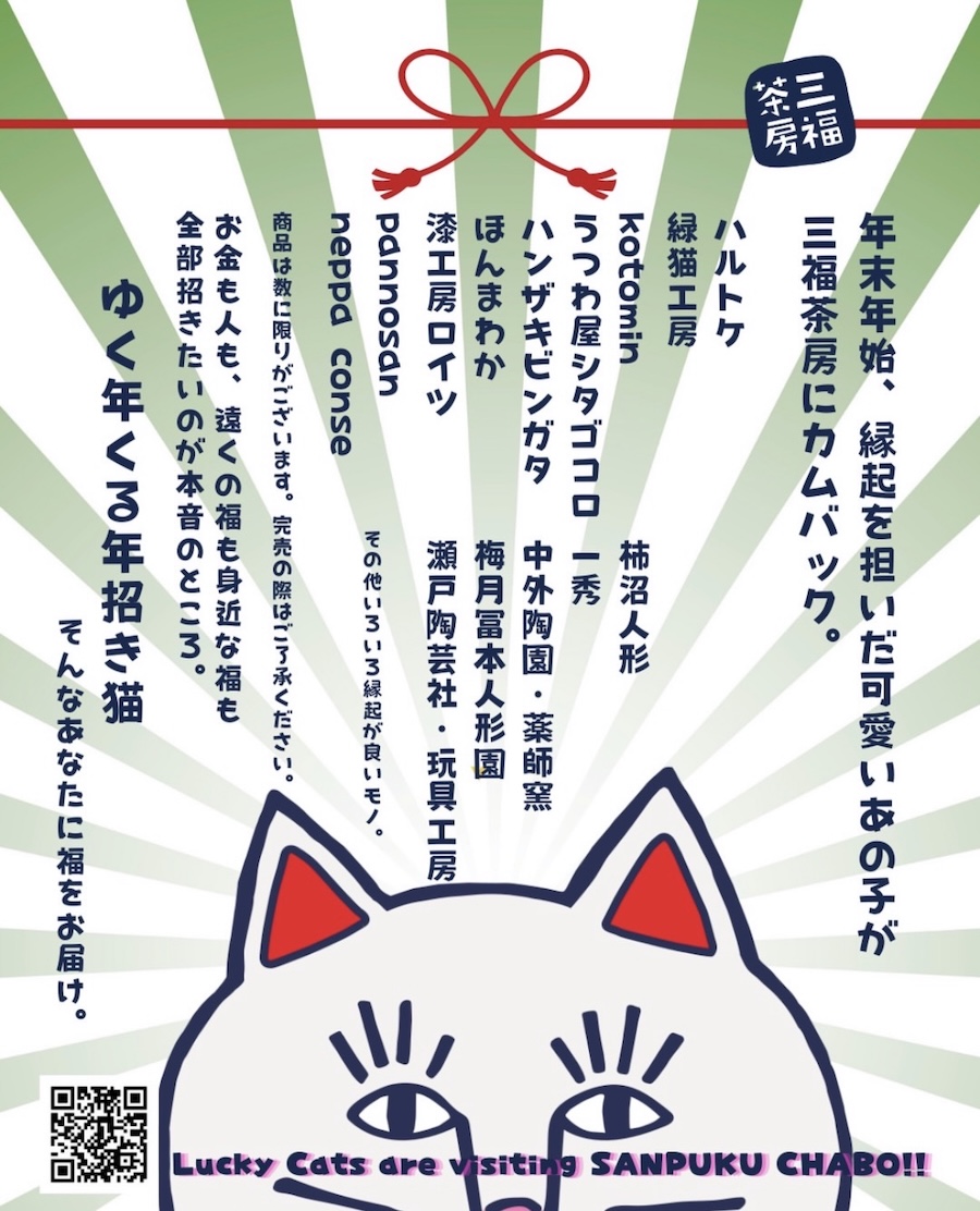 読谷村のGala青い海にある日本茶専門店「三福茶房」で、たくさんの招き猫と猫グッズが勢揃するポップアップイベント「ゆく年くる年招き猫…となかまたち展。vol.2」が開催される。期間は2025年12月20日(土)~2026年1月12日(月・祝)まで。