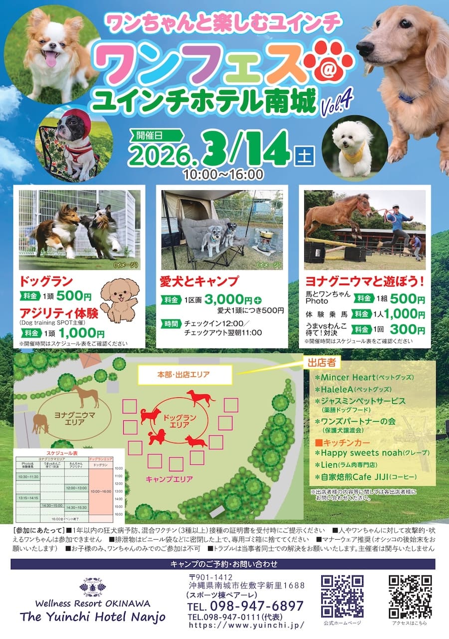 絶景が楽しめるユインチホテル南城の広いキャンプ場を会場に、愛犬と一緒に家族みんなで楽しめるイベント。思いっきり走り回れるドッグランやアジリティ体験、「ウマとワンちゃんPHOTO&体験乗馬」や「うまVSわんこ待て!対決」など、ここでしかできない体験が盛りだくさん。