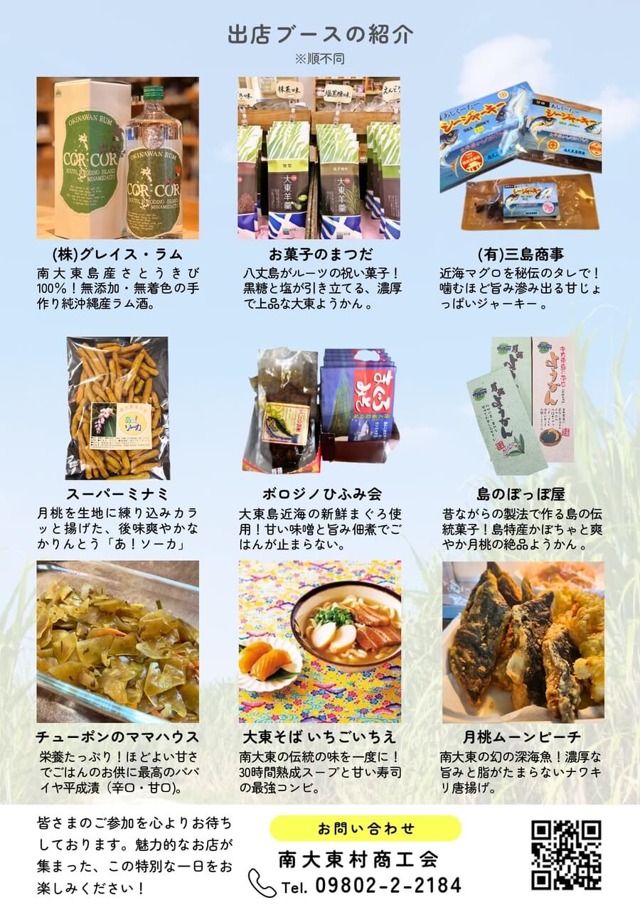この2日間は、南大東島産さとうきび100%の純沖縄産ラム酒、濃厚な旨みと脂がたまらない南大東の幻の深海魚“ナワキリ”の唐揚げ、30時間熟成スープでいただく大東そば&甘い大東寿司の最強コンビなど、個性豊かな品が並ぶ。