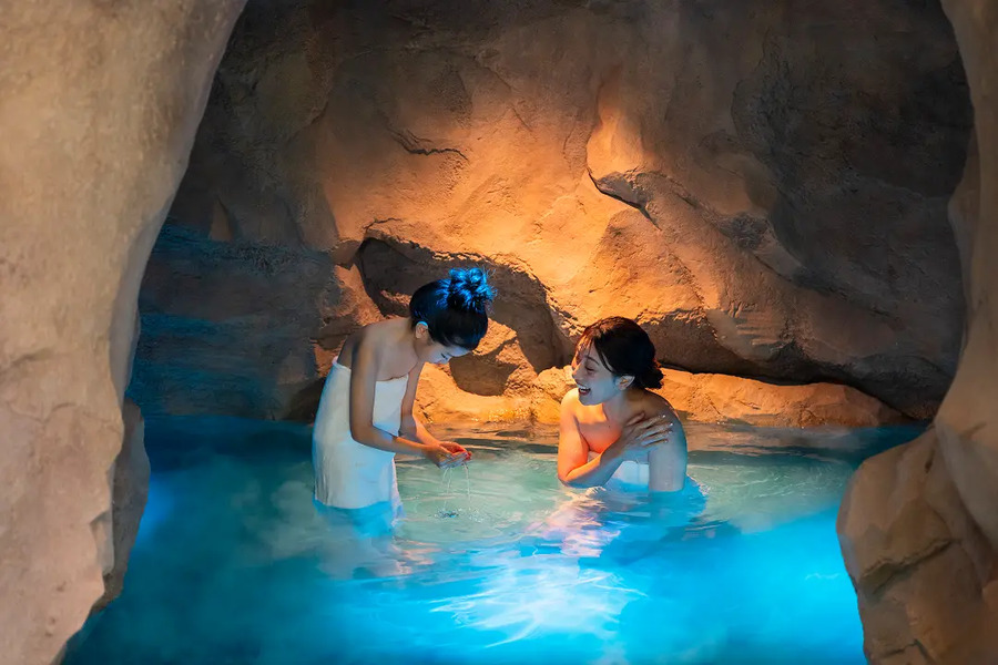 青い光が幻想的な洞窟風呂は、大人も子どももドキドキわくわく。日常では体験できない特別な入浴時間に。
