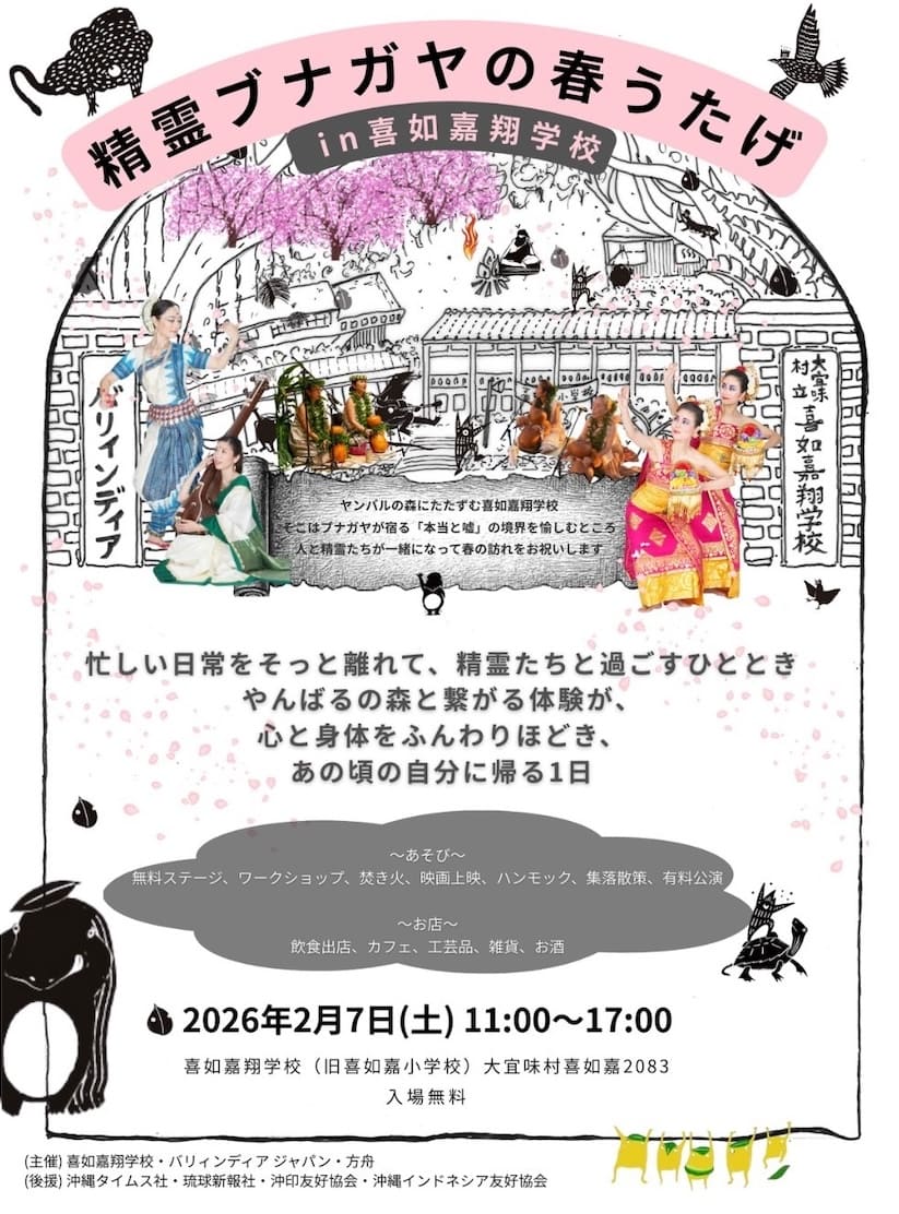 桜が満開を迎える頃の2026年2月7日(土)、「精霊ブナガヤの春うたげ in 喜如嘉翔学校」が開催される。