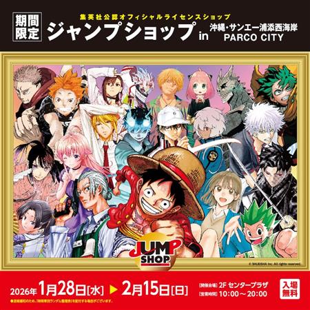 『ONE PIECE』や『SAKAMOTO DAYS』『アオのハコ』『カグラバチ』『魔男のイチ』など、人気作品をはじめとした原作イラストグッズが満載の「期間限定 ジャンプショップ」が、サンエー浦添西海岸パルコシティにオープンする。期間は2026年1月28日(水)~2026年2月15日(日)。