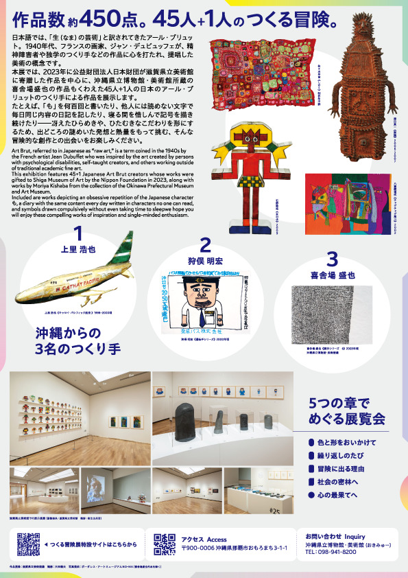 本展では、2023年に公益財団法人日本財団が滋賀県立美術館に寄贈した作品を中心に、沖縄県立博物館・美術館所蔵の喜舎場盛也も加えた45人+1人の日本のアール・ブリュットのつくり手による作品約450点を展示。
