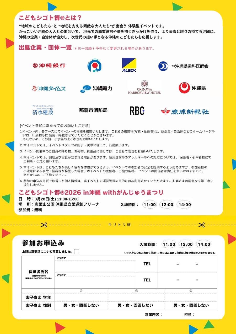「こどもシゴト博2026 in 沖縄 with がんじゅうまつり」は参加無料で事前申し込み制。定員になり次第締め切りなので、ぜひ早めに申し込もう。