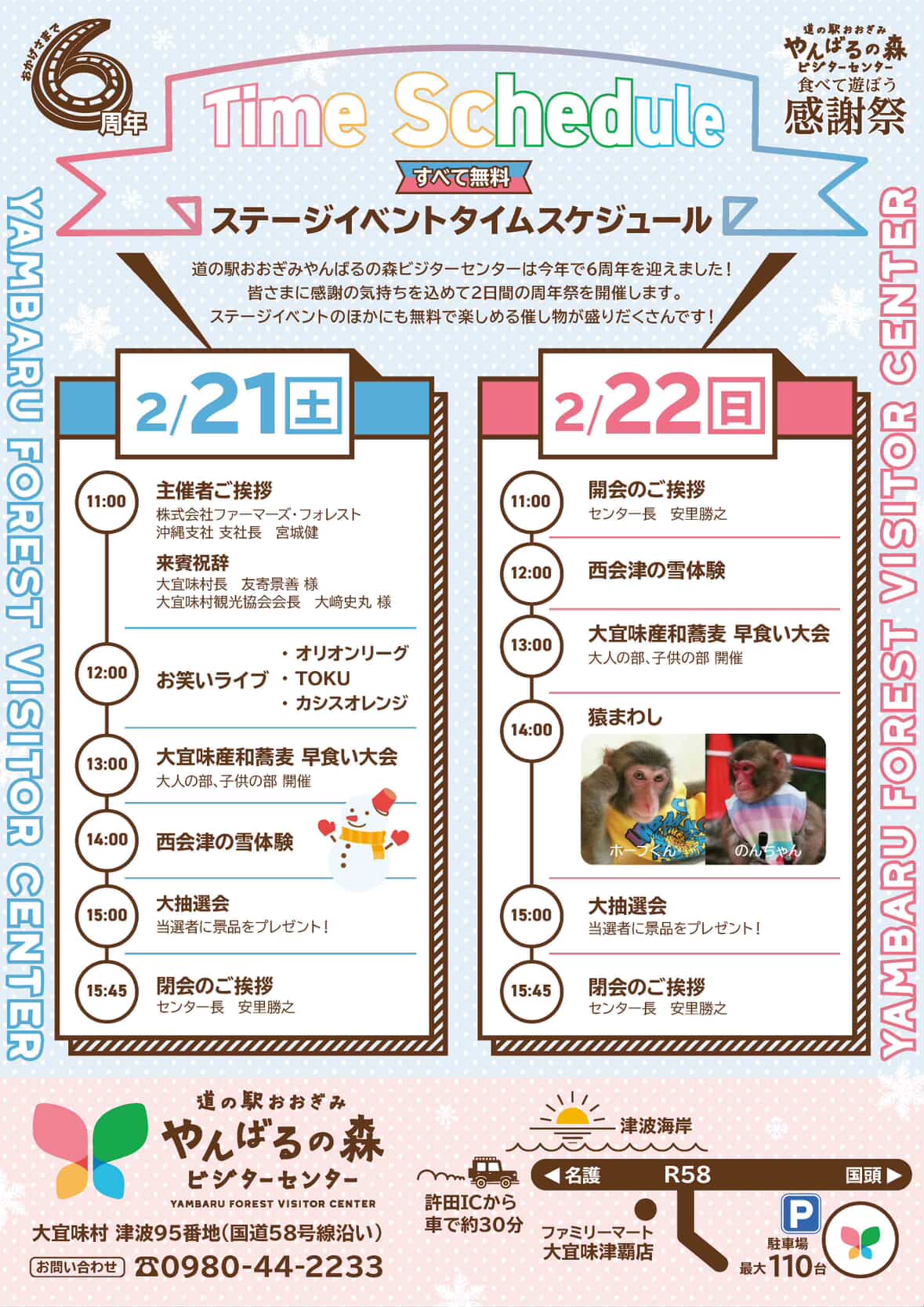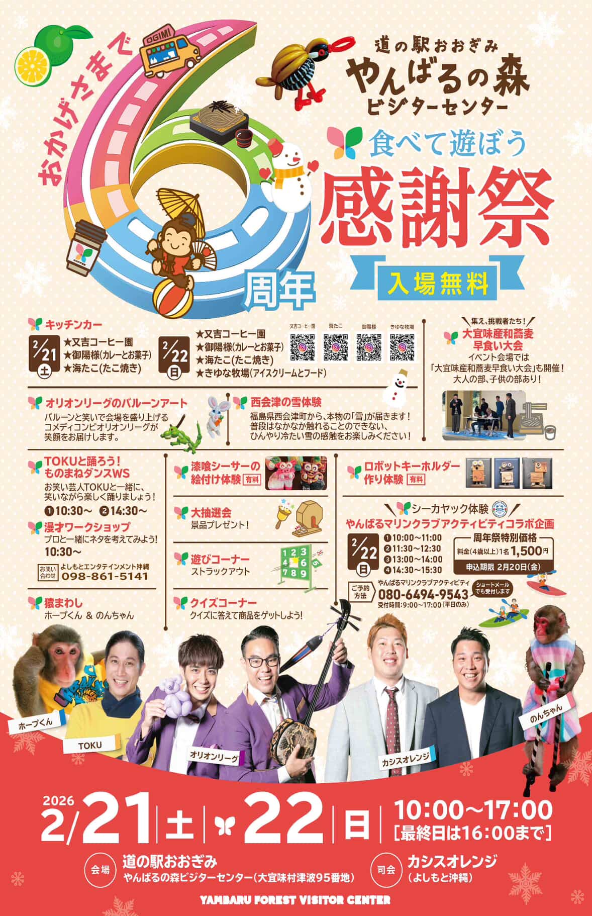 2026年2月21日(土)・22日(日)の2日間、大宜味村にある道の駅おおぎみ・やんばるの森ビジターセンターで6周年感謝祭が開催される。