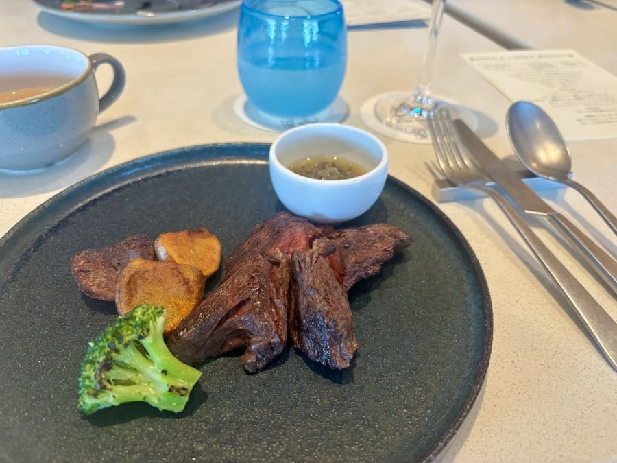 今回メインに選んだのは「バベットステーキ ラビゴッドソース」。ほかにも、あぐー豚やハーブ鶏、沖縄の高級魚・赤マチを使ったメニューなど、どれを選ぼうか迷ってしまう魅力的なラインナップが揃う。食後は紅茶やコーヒーとともにデザートを味わい、ランチタイムは至福の締めくくりとなった。