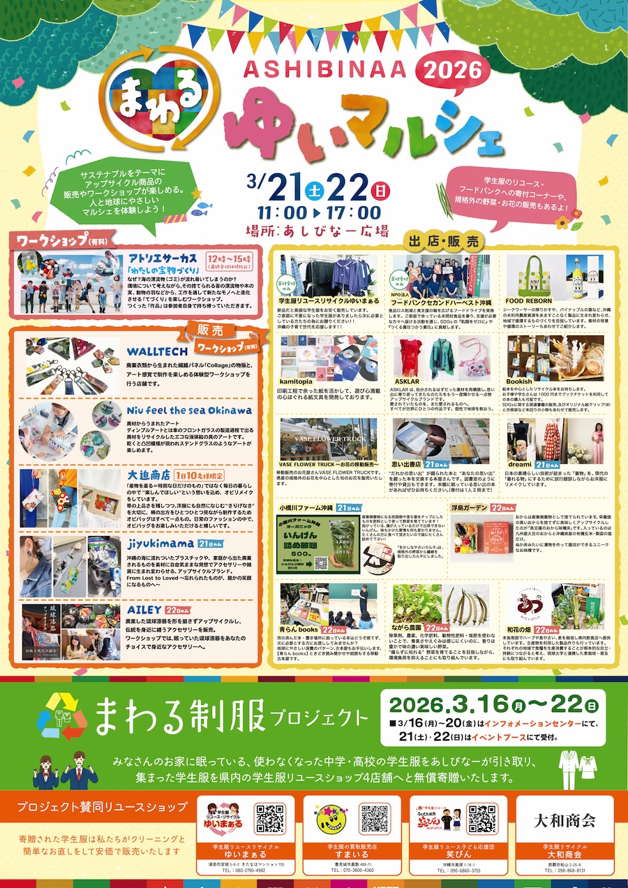 2026年3月21日(土)・22日(日)の2日間、沖縄アウトレットモールあしびなーで、サステナブルをテーマにした「まわる ゆいマルシェ」が開催される。