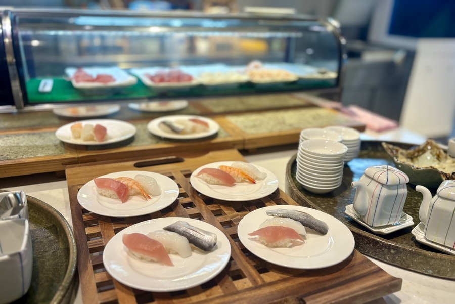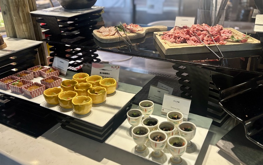 ライブキッチンでは、ローストビーフや寿司、天婦羅を出来立てで提供。土日祝には和牛炙り寿司も加わり、満足度をさらに高めてくれる。