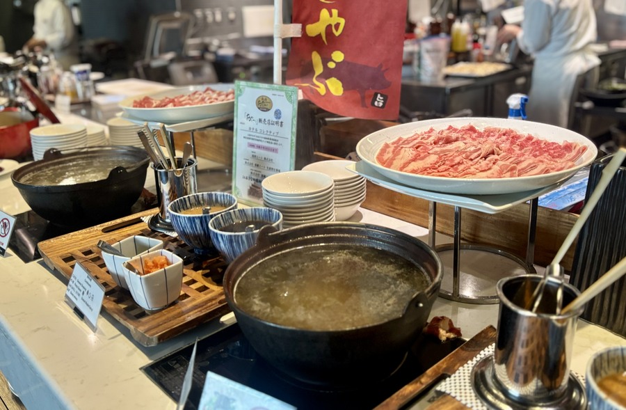 1月からはレギュラーメニューにスペアリブが仲間入り。スタッフが目の前で切り分けてくれるライブ感も魅力だ。定番の人気メニュー「あぐー豚のしゃぶしゃぶ」に加え、土日祝限定で「海老のしゃぶしゃぶ」も登場。フェアならではの味わいを楽しみたい。